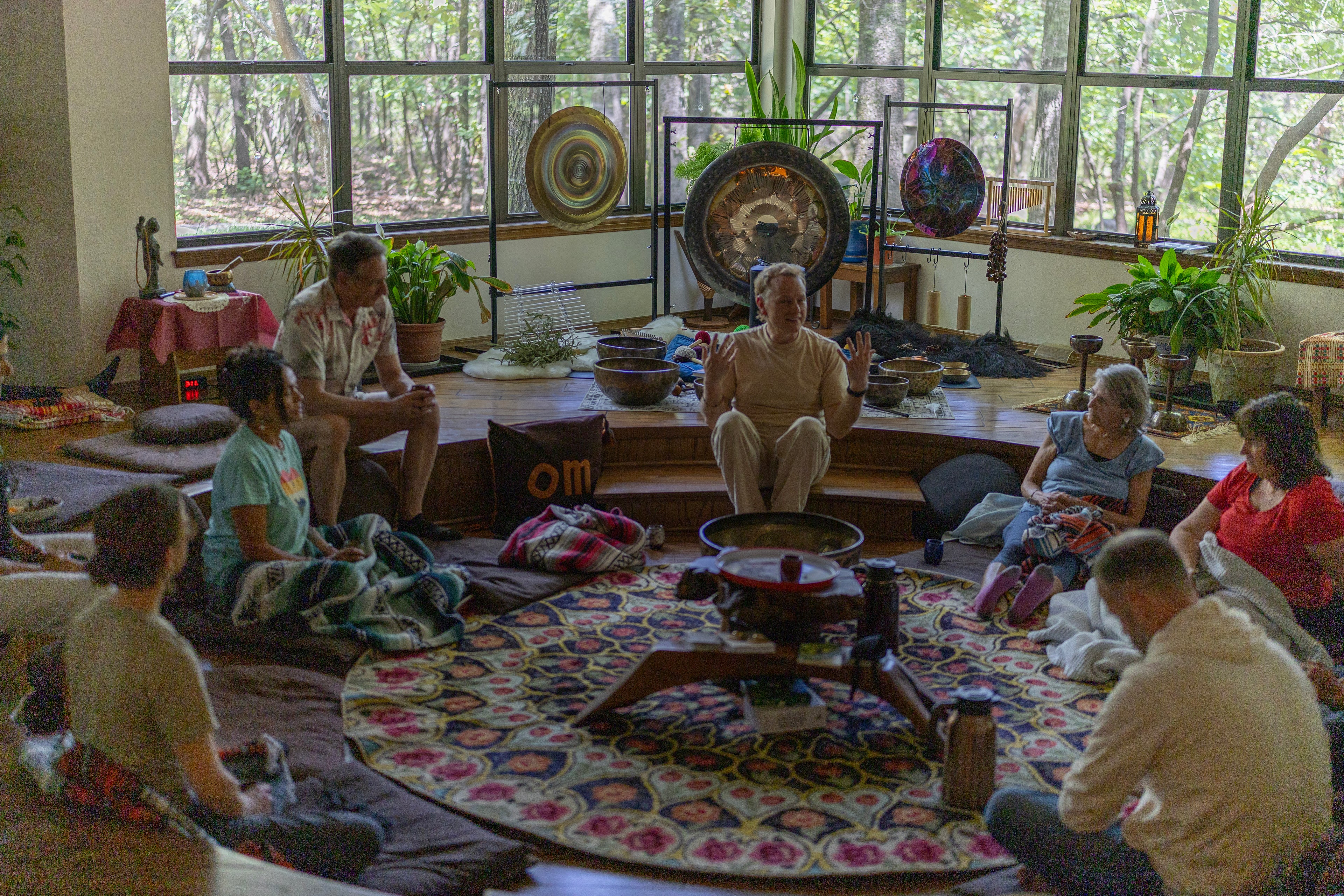 A sound bath is a meditative experience where attendees lay on a cushioned floor mat with a pillow and blanket, and sometimes eye mask, while being simultaneously "bathed" in sound waves & frequencies. These vibrations are produced by healing instruments such as gongs, singing bowls, chimes, percussion, rattles, shakers, tuning forks, and even the human voice. Chairs are also available for those would rather sit.